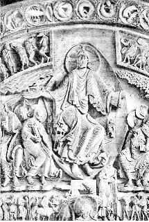 Le Christ, assis au centre du portail central, dans un grand nimbe en amande, les bras largement ouverts, occupe la place du trône. Seigneur et maître des trois mondes, son immanente présence rayonne sur la voûte céleste. Demi cercles et spirales sur sa tunique nous attestent lauthenticité de la tradition vézelienne et nous rappellent que cest par révolutions cycliques que notre pierre évoluera vers toujours plus de pureté.Le corps du Christ est cerclé par une auréole ovoïde, une amande mystique. Ce symbole nous indique que lamande, comme la graine ou la semence, se trouve toujours cachée dans lobscurité totale et nous révèle un haut point de la science.