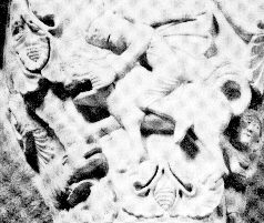 Au chapiteau 2 du narthex nous découvrons un thème identique. Mais cest ici Samson, dont la force extraordinaire réside dans les longs cheveux, qui terrasse le lion, apportant ainsi sa part de révélation au niveau de la science que nous étudions.La sainte bible nous raconte en effet que : « Dalila endormit son mari sur ses genoux, appela un homme et lui fit raser les sept tresses de la tête ». Et nous pouvons affirmer que cest bien aussi grâce à chacune de ses sept tresses, récoltée à lissue de chaque sublimation, que le Mercure acquerra toute sa vigueur.