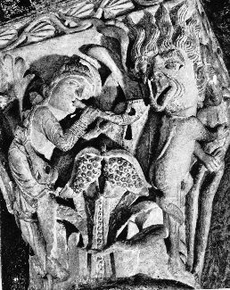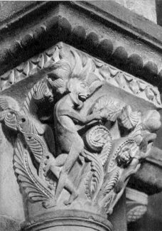 Sommaire SuiteAu chapiteau 8 du narthex, nous découvrons la Dame et le dragon tels que décrits dans « lexécution des décrets du petit livre ouvert » de lApocalypse de Saint Jean. De la gueule du dragon sort un fleuve destiné à noyer la femme. Nous avons ici de plus amples détails sur la manière douvrir le petit livre. Il nous faut en effet noyer la femme, notre mère primordiale afin de la débarrasser de ses impuretés et de lui voir prendre, à chaque cycle, plus déclat et de beauté. Et pour plus de détails nous citerons ce passage de Saint Jean : « Une femme enveloppée dans le soleil, la lune sous ses pieds, la tête couronnée de douze étoiles était enceinte et criait dans les douleurs de lenfantement. Puis un second signe apparut au ciel : un grand dragon roux à sept têtes et dix cornes et sur les sept têtes, sept diadèmes. Le dragon se mit à la poursuite de la femme qui reçut les deux ailes du grand aigle pour voler au désert, un temps, deux temps et un demi temps. Le serpent alors de cracher contre la femme un torrent deau pour la noyer ».